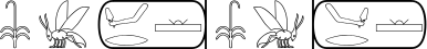 Sometimes we want to separate two hieroglyphs by a block of white space of specified width and height. We call such an object an empty glyph. The default dimensions of empty glyphs are 1 EM, unless specified otherwise. (1 EM is roughly the height of a high hieroglyph such as 'A1' and the width of a wide hieroglyph such as 'N37'. E.g. in the following we separate the first two actual hieroglyphs by an empty glyph of 1 EM high and 0.5 EM wide, and the last two actual hieroglyphs are separated by a shaded empty glyph of 2 EM wide.