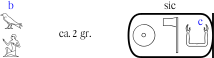 wr^"b"[blue]:A1 - empty[width=2]^"ca. 2 gr." - cartouche(ra-nTr-kA^"c"[blue])^"sic"